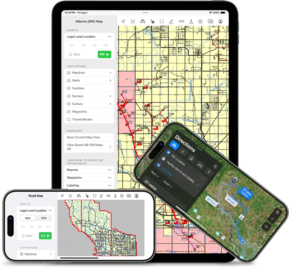 Available exclusively on the App Store, LITEning’s fast mapping engine of Western Canada makes navigation easy offline. LITEning features an intuitive interface with GPS tracking to quickly and accurately map roads, pipelines, survey boundaries, dispositions, and more. Track your current location on the map, and trace roads that have been travelled.