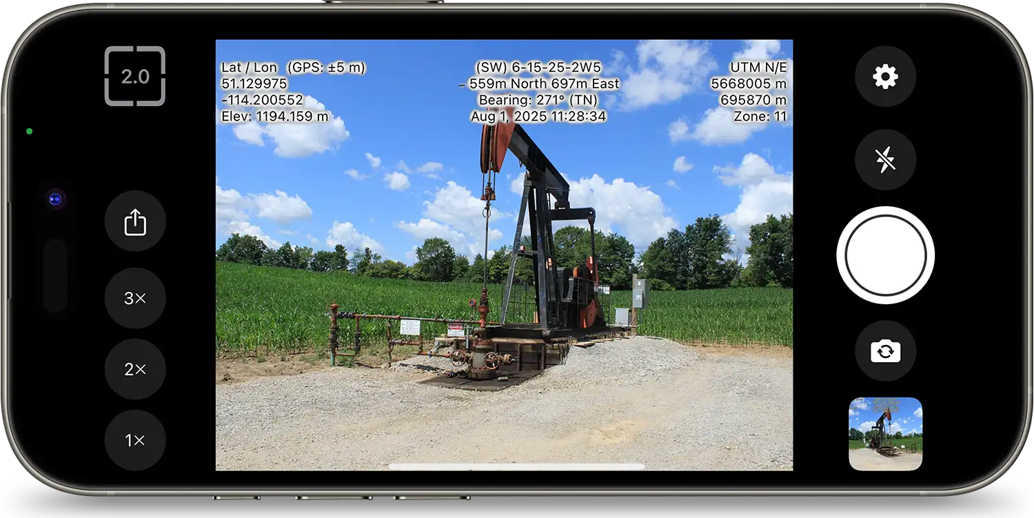 Capture photos and add watermarks of various location-specific details, including Latitude/Longitude, LSD/NTS Grid Location, UTM Coordinates, Bearing, Elevation, Street Address, Date/Time, and more, on images.