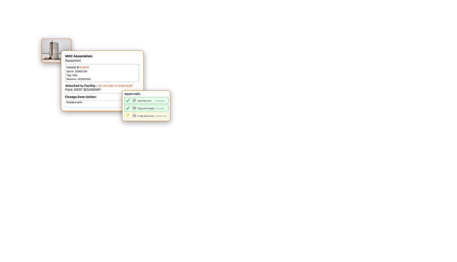 From vessels to valves to pumps, you can track all of your equipment assets in one centralized location. Manage maintenance, MOCs, transfers, and more!