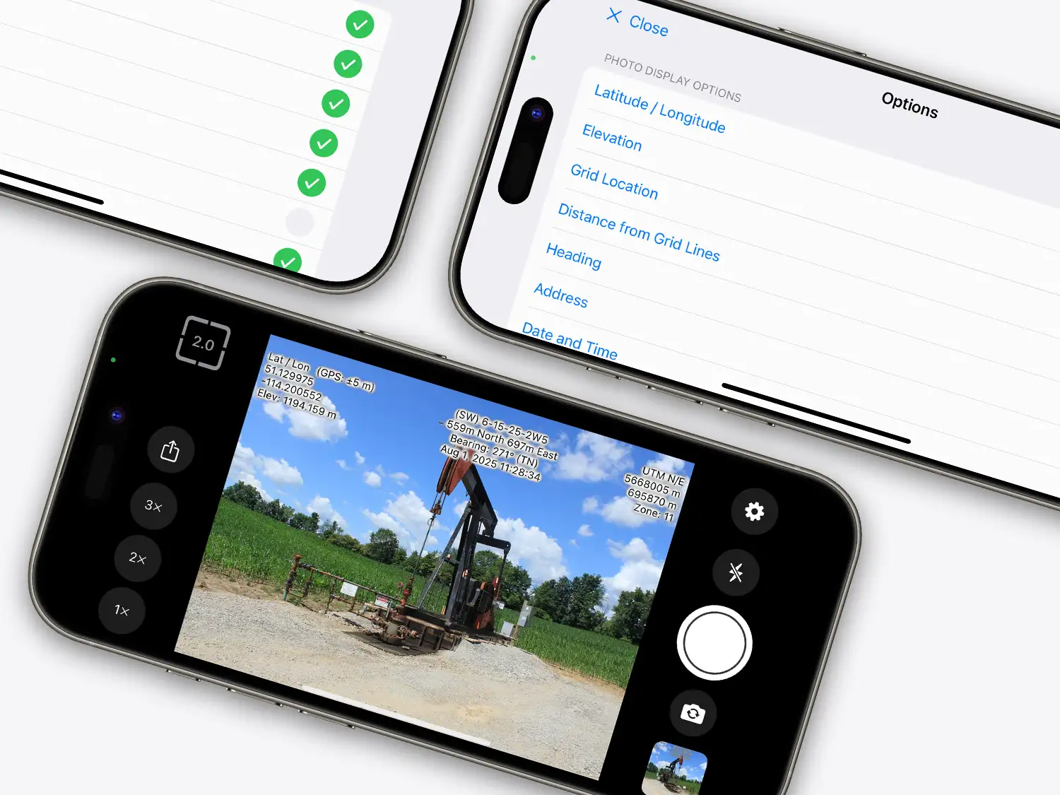 Capture photos and add watermarks of various location-specific details, including Latitude/Longitude, LSD/NTS Grid Location, UTM Coordinates, Bearing, Elevation, Street Address, Date/Time, and more, on images.
